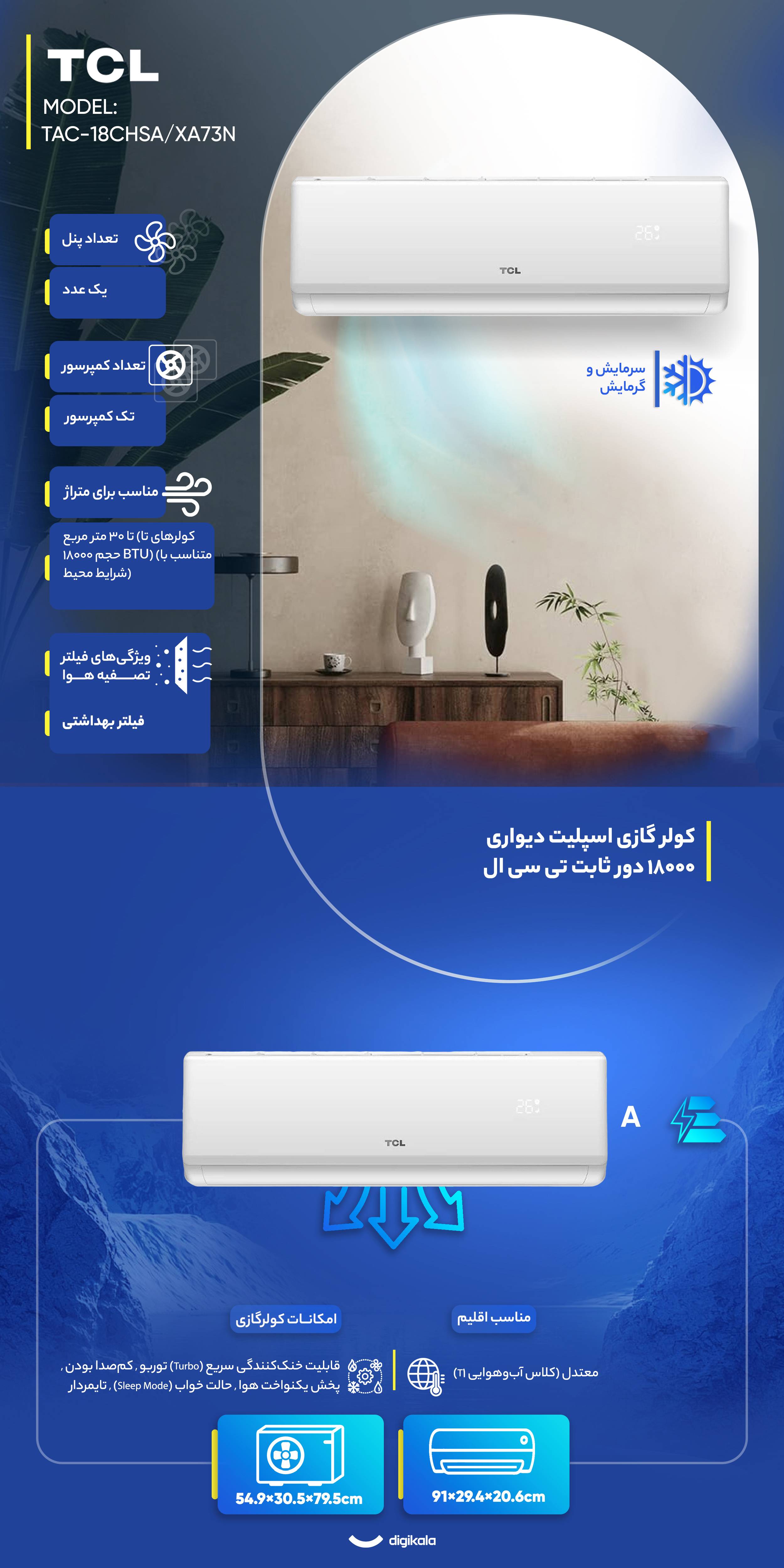 کولر گازی اسپلیت دیواری 18000 دور ثابت تی سی ال مدل TAC-18CHSA/XA73N