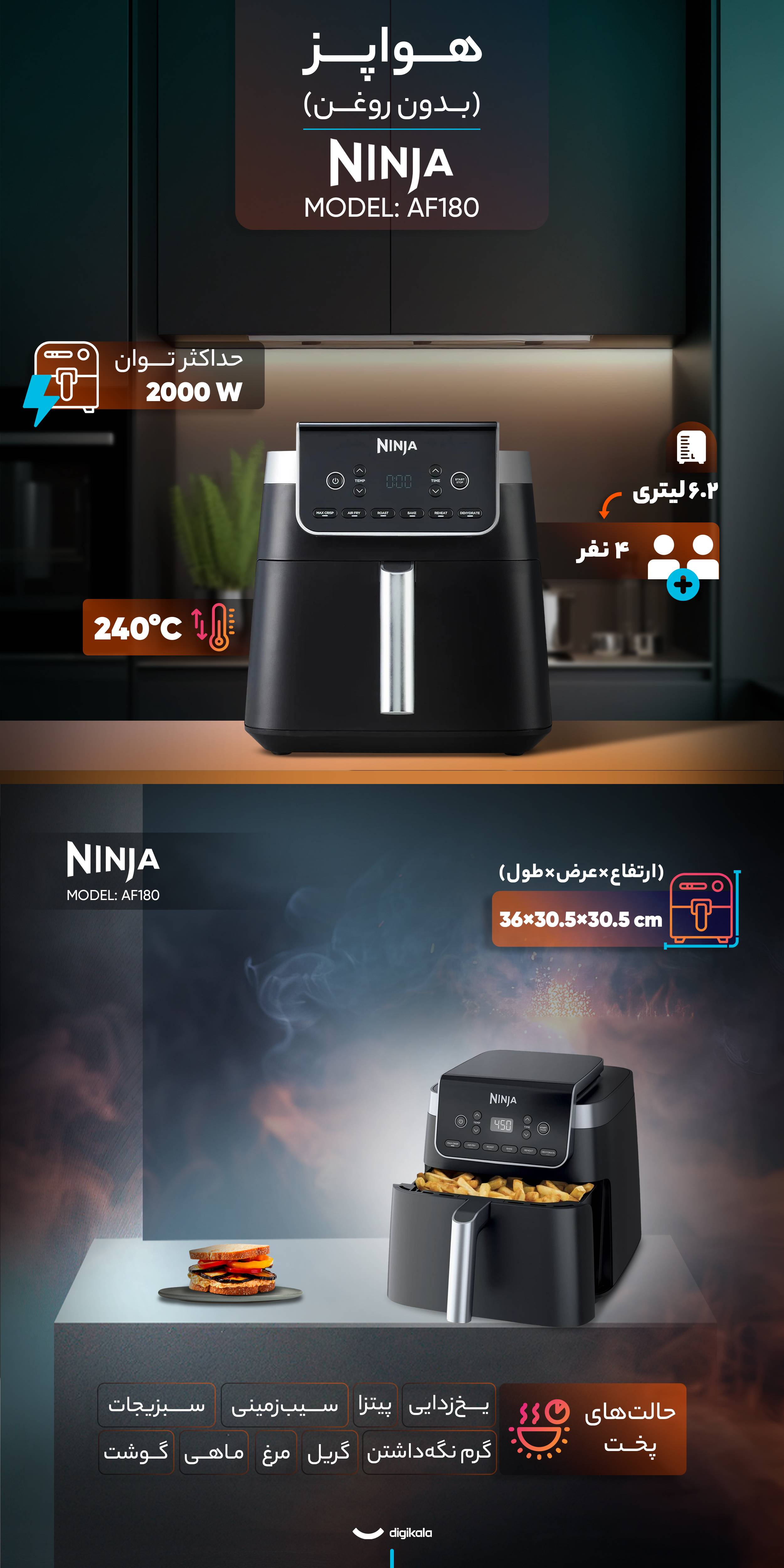 سرخکن هوای گرم نینجا تا 60٪ صرفهجویی در انرژی و 50٪ سریعتر از اجاقهای سنتی عمل میکند. با 75٪ چربی کمتر غذاهایی سالمتر آماده کنید و از روغن کم یا بدون روغن استفاده کنید. این دستگاه با 6 عملکرد متنوع شامل سرخکردن، برشتهکردن، پختن و آبگیری، گزینهای ایدهآل برای پخت سریع غذاهای اصلی و میانوعدههاست. ظرفیت 6.2 لیتری آن برای خانوادهها مناسب بوده و فضای کافی برای 4 سینه مرغ دارد. محتویات شامل کشوی نچسب قابل شستشو، توری قابل تنظیم و کتاب آشپزی است. رنگ خاکستری با طراحی جمع ...بیشتر