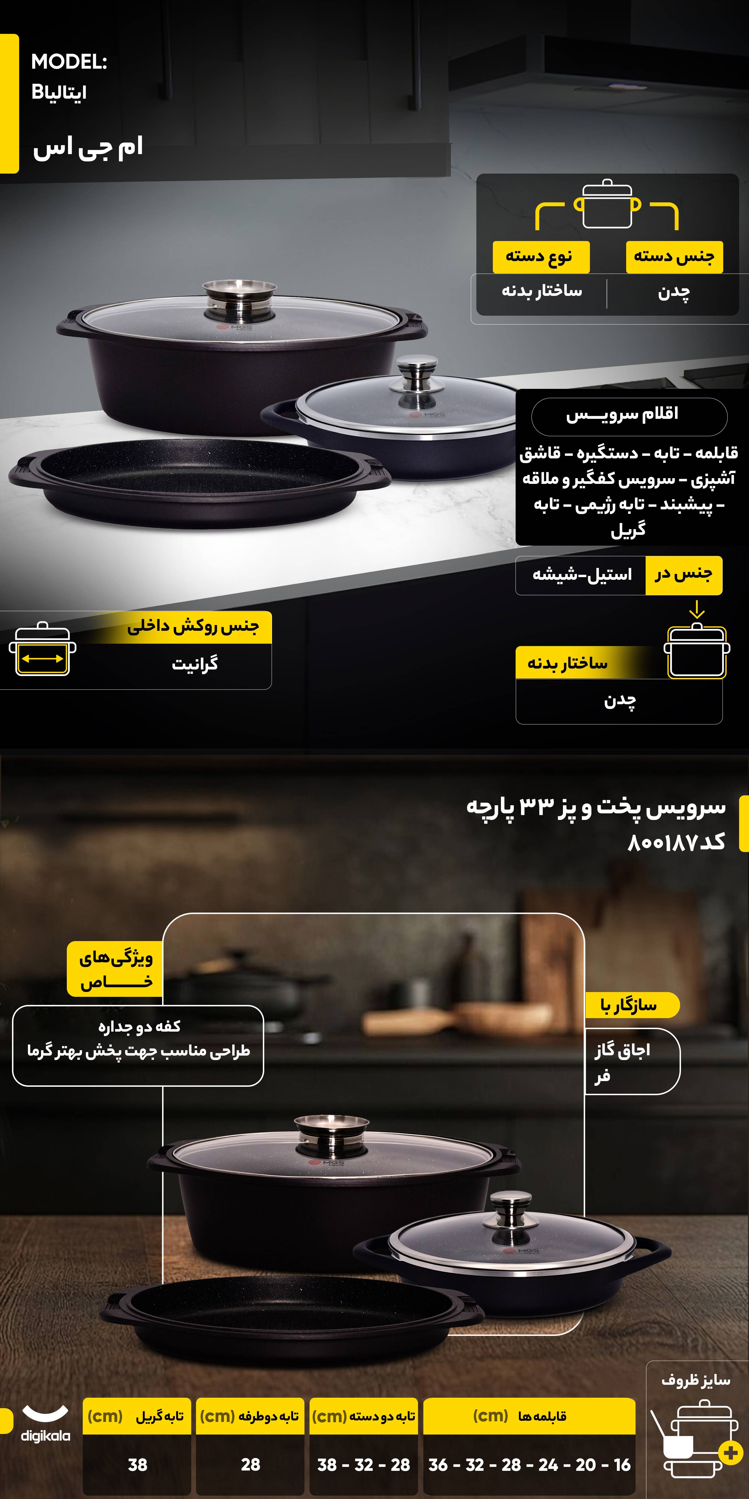 سرویس پخت و پز 33 پارچه MGS طرح ایتالیا B تجربهای کامل برای آشپزی روزمره به همراه تمام نیازهای خانواده فراهم آورده است. نوع کالا شامل قابلمه، تابه و ابزار آشپزی متنوع با پوشش گرانیتی است. اقلام سرویس شامل قابلمههای قطر 16، 20، 24، 28، 32 و 36 سانتیمتر؛ دو تابه دو دسته در قطر 28 و 32 سانتیمتر، تابه رژیمی گرد 28 سانتیمتری، تابه ویژه مرغ و ماهی بیضی 38 سانتیمتری همراه درب پیرکس مشترک و قالب گریل ومرغپز 38 سانتیمتری، ست هفتتکه کفگیر و ملاقه، چهار عدد دستگیره و یک پیشبند ...بیشتر