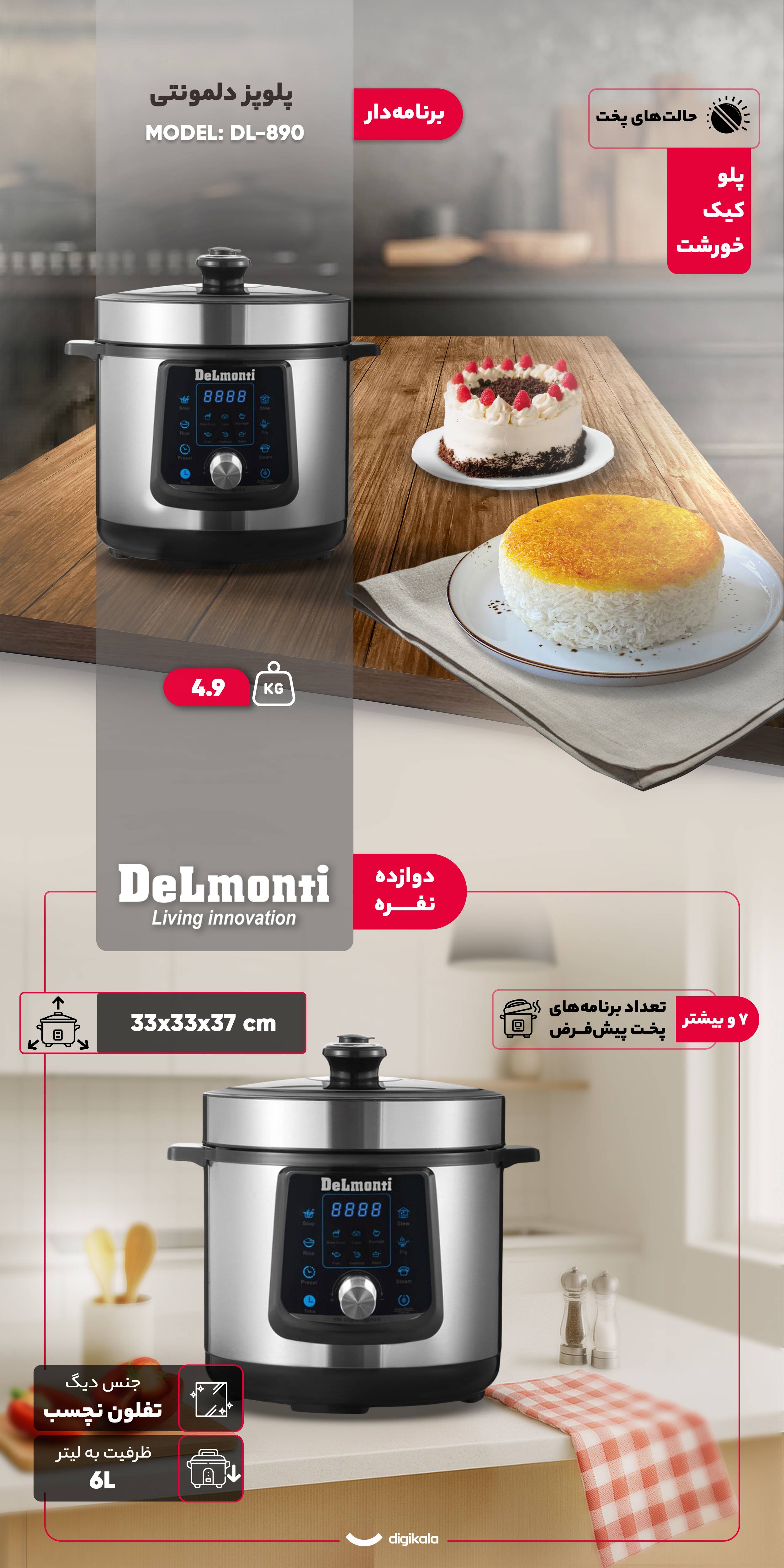 پلوپز 12 نفره دلمونتی مدل DL-890 یک دستگاه برنامهدار با ظرفیت بالا است که برای خانوادههای پرجمعیت یا میهمانیها طراحی شده و امکان پخت حجم زیادی از برنج و سایر غذاها را فراهم میکند. ظرفیت 6 لیتری دیگ دستگاه، فضای کافی برای آمادهسازی وعدههای غذایی برای 12 نفر را ایجاد کرده و بدنه استیل ضد زنگ آن علاوه بر استحکام بالا، ظاهری مدرن و شیک به آشپزخانه میبخشد. بخشهای پلاستیکی دستگاه کیفیت مناسبی دارند و مقاومت آنها در استفاده روزمره قابل قبول است.