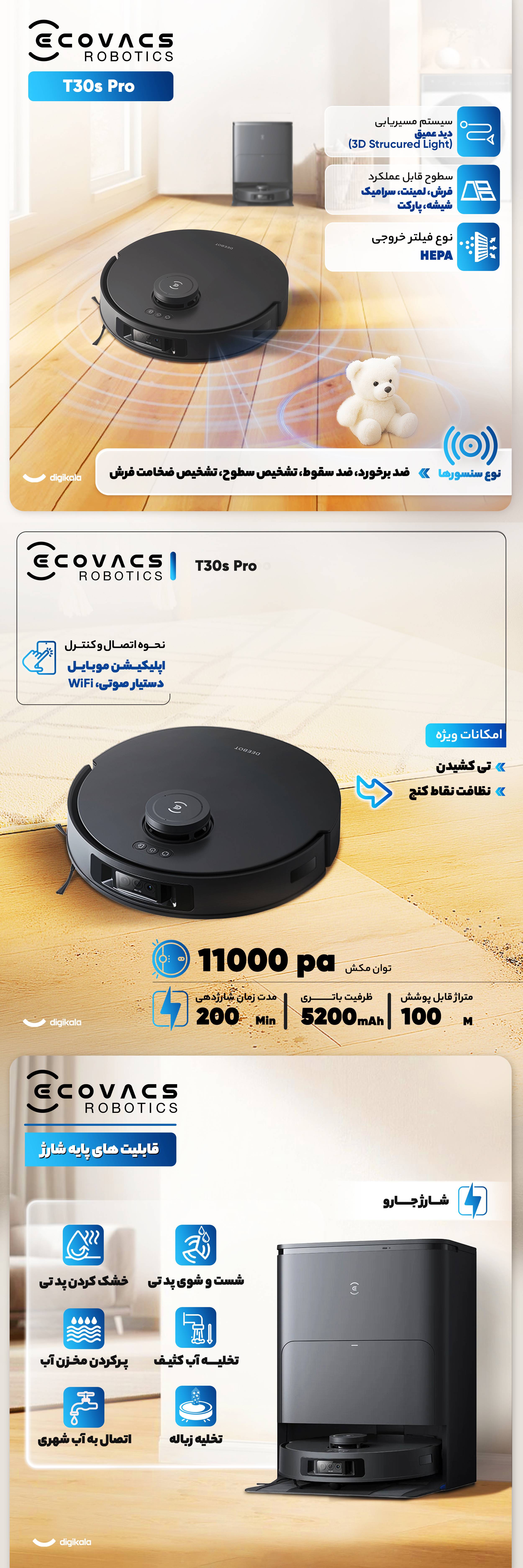 جارو رباتیک Ecovacs T30s Pro یک راهحل هوشمند و پیشرفته برای تمیز کردن خانه با امکانات برجسته است که از جمله ویژگیهای آن میتوان به موارد زیر اشاره کرد:قدرت مکش 11000 پاسکال،که از یک موتور قوی بهرهمند است که به ویژه در تمیز کردن فرشها و گرد و غبار سطوح سخت عملکردی بینظیر دارد. این جارو از تکنولوژی TrueMapping 2.0 بهره میبرد که نقشهبرداری دقیق از محیط را با سرعت بالا انجام میدهد و میتواند مساحت 100 متر مربع را تنها در 6 دقیقه نقشهبرداری کند. همچنین، این جارو قابلیت ذ ...بیشتر