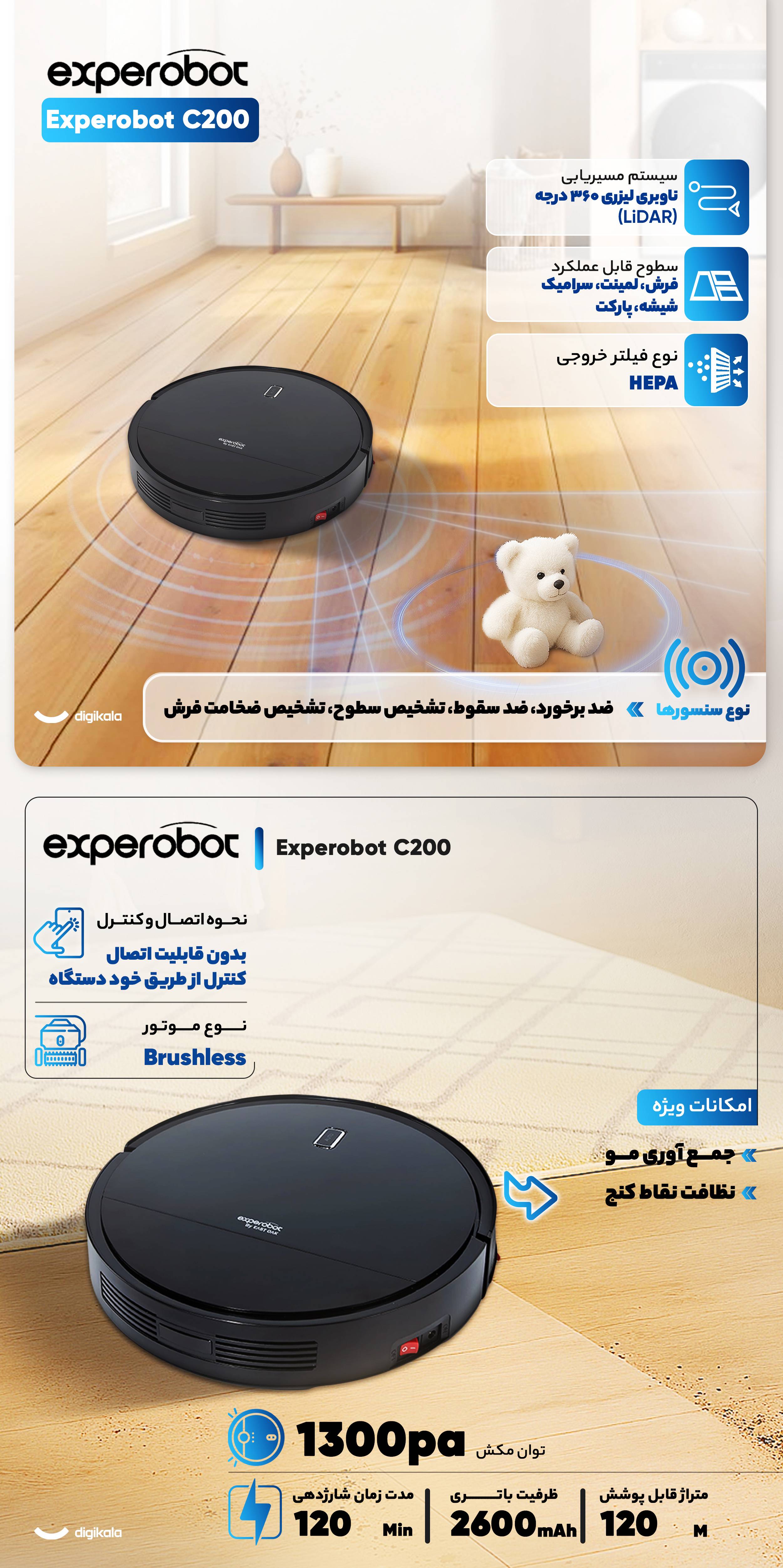 جاروبرقی رباتیک Experobot C200 با طراحی مدرن و ابعاد فشرده 80×320×320 میلیمتر و وزن 2.3 کیلوگرم، انتخابی ایدهآل برای نظافت هوشمندانه منزل شماست. این دستگاه با توان مکش 1300 پاسکال و مخزن زباله 0.5 لیتری، گردوغبار و زباله را از سطوح مختلفی مانند پارکت، سرامیک، شیشه، لمینت و فرش به خوبی جمعآوری میکند. موتور قدرتمند براشلس (Brushless) در کنار فیلتر خروجی HEPA، هوای خروجی را به طور کامل تصفیه کرده و محیطی عاری از آلودگی را برای شما فراهم میآورد. باتری 2600 میلیآمپر ساعتی ا ...بیشتر