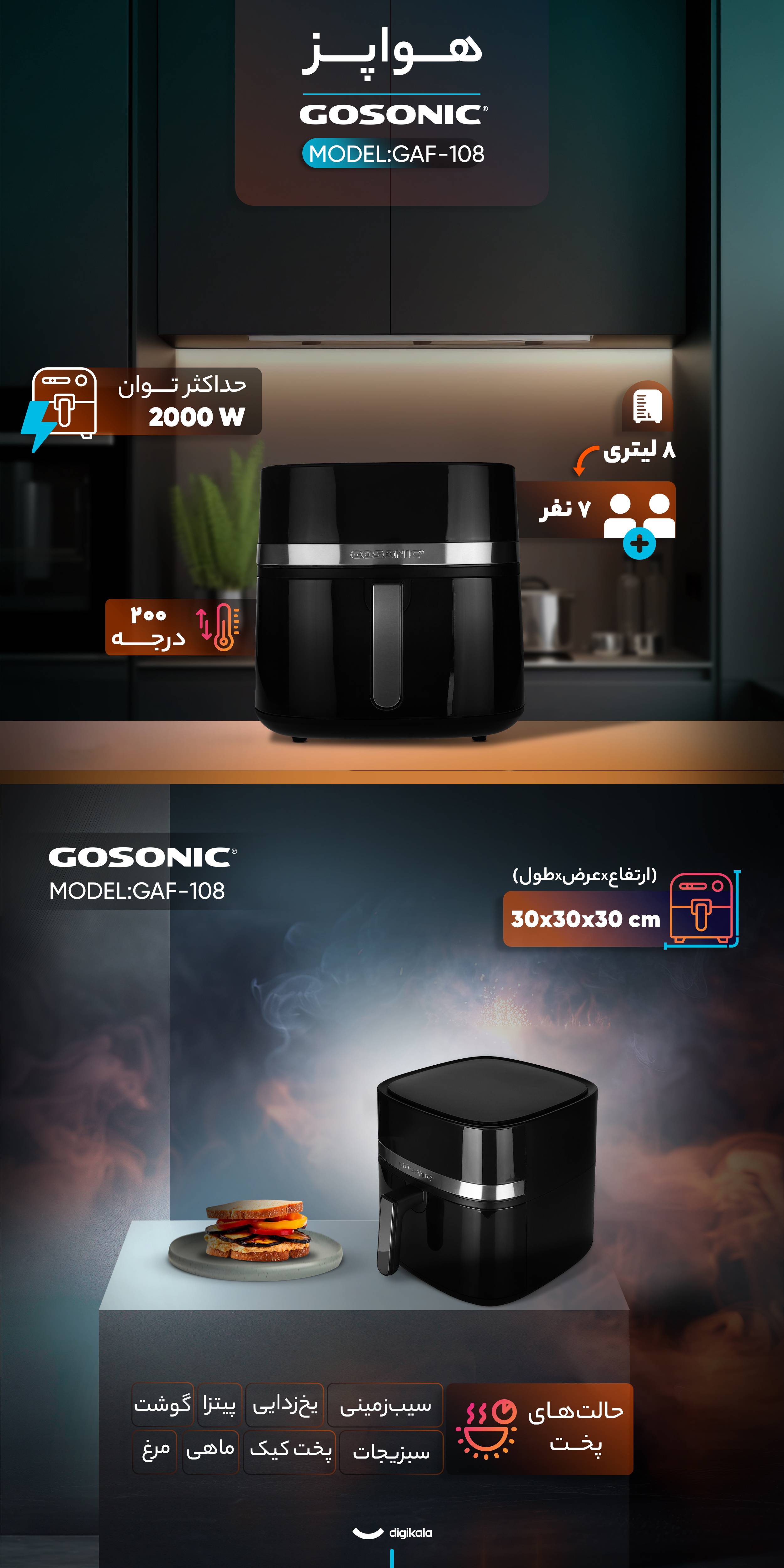 هواپزها به عنوان نسل جدید سرخکنها، جای خود را در آشپزخانههای مدرن باز کردهاند و یکی از نمونههای کاربردی و پرطرفدار در این گروه، هواپز 8 لیتر گوسونیک مدل GAF-108 است. این محصول از نوع سرخکن بدون روغن (هواپز) بوده و با بهرهگیری از تکنولوژی گردش هوای داغ، غذاها را با حداقل روغن آماده میکند.