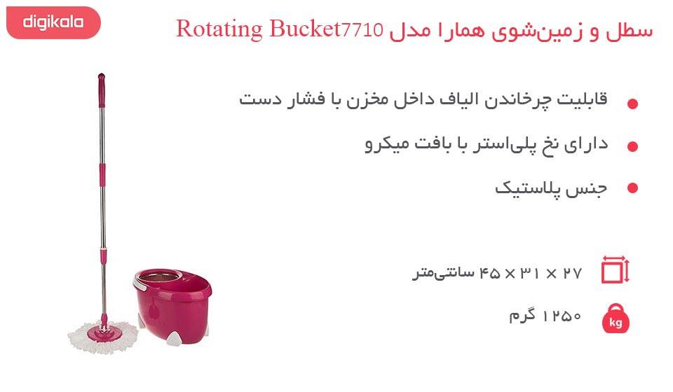 سطل و زمین‌شوی همارا مدل «Rotating Bucket 7710» مجموعه‌ای کامل و کاربردی برای نظافت منزل است. جنس بدنه‌ی این سطل پلاستیکی است و به همراهش یک زمین‌شوی وجود دارد که دسته‌ای استیل دارد. دسته‌ی این زمین‌شوی سبک و درعین‌حال ارگونومیک است و کمترین فشار را بر استفاده‌کننده وارد می‌کند.کارایی 4 جنس بدنه 3 ارزش خرید 3 کیفیت ساخت 3 نکات مثبتارایه شده در رنگ های گوناگون و جذابدارای دسته استیل و سبک با اندازه متناسباندازه جمع و جور و مناسب آن برای محیط های کوچکتر