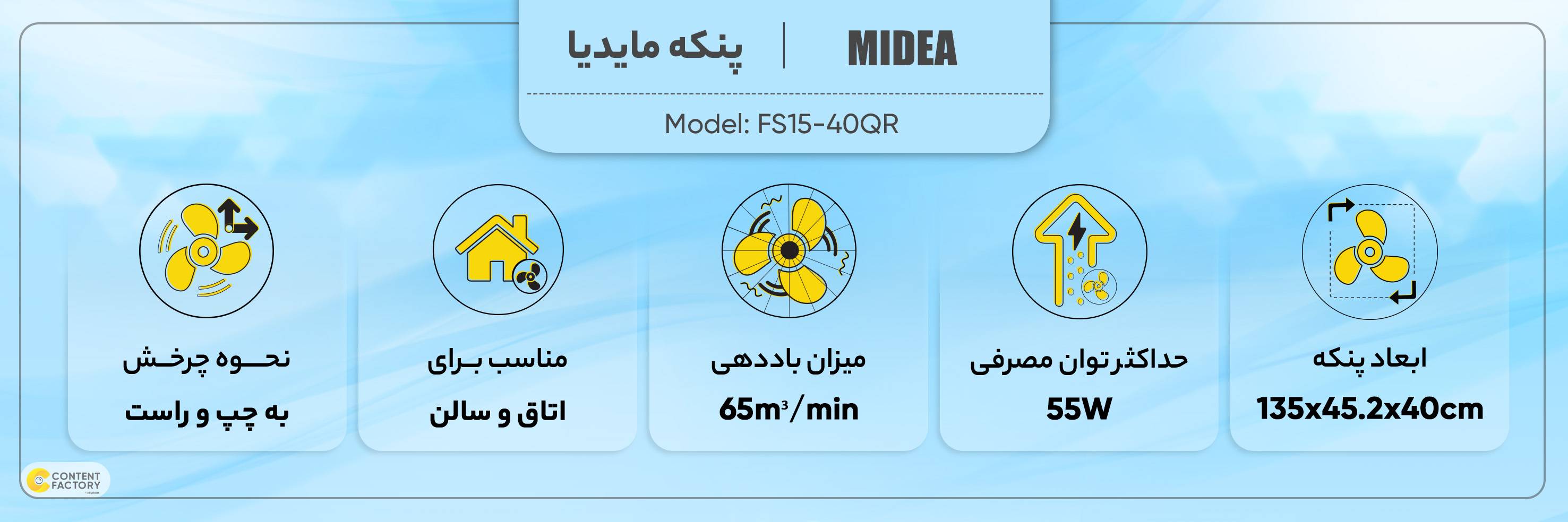 به طور کلی پنکه مایدیا مدل FS40-15QR کالایی ایستاده و حرفه‌ای با امکان تنظیم نوع وزش باد در سه حالت مختلف نرمال، طبیعی و بی‌صدا است که از یک نمایشگر LED، تایمر 7.5 ساعت و عملکرد خاموشی اتوماتیک پشتیبانی می‌کند. سر پنکه به صورت اتوماتیک قابلیت چرخش به سمت چپ و راست را دارد ولی متاسفانه از حالت سینوسی پیروی نمی‌کند. همین مساله هم می‌تواند یکی از نقاط ضعف این محصول باشد. حجم باددهی این سیستم 56 متر مکعب در دقیقه و سرعت گردش پروانه‌های آن 1250 دور در دقیقه است از این رو برای پنکه مایدیا مدل FS40-15QR برای خانه‌هایی با ابعاد زیر ۱۲۰ متر کاملا کاربردی است. همچنین از منظر ایمنی این پنکه دارای فیوز حرارتی به منظور جلوگیری از داغ شدن بیش از حد موتور است و در کنار آن شبکه‌ی محافظ محکمی بر روی پره‌های خود دارد. پنکه مایدیا مدل FS40-15QR با امکان نصب و راه‌اندازی راحت و سریع همراه است.