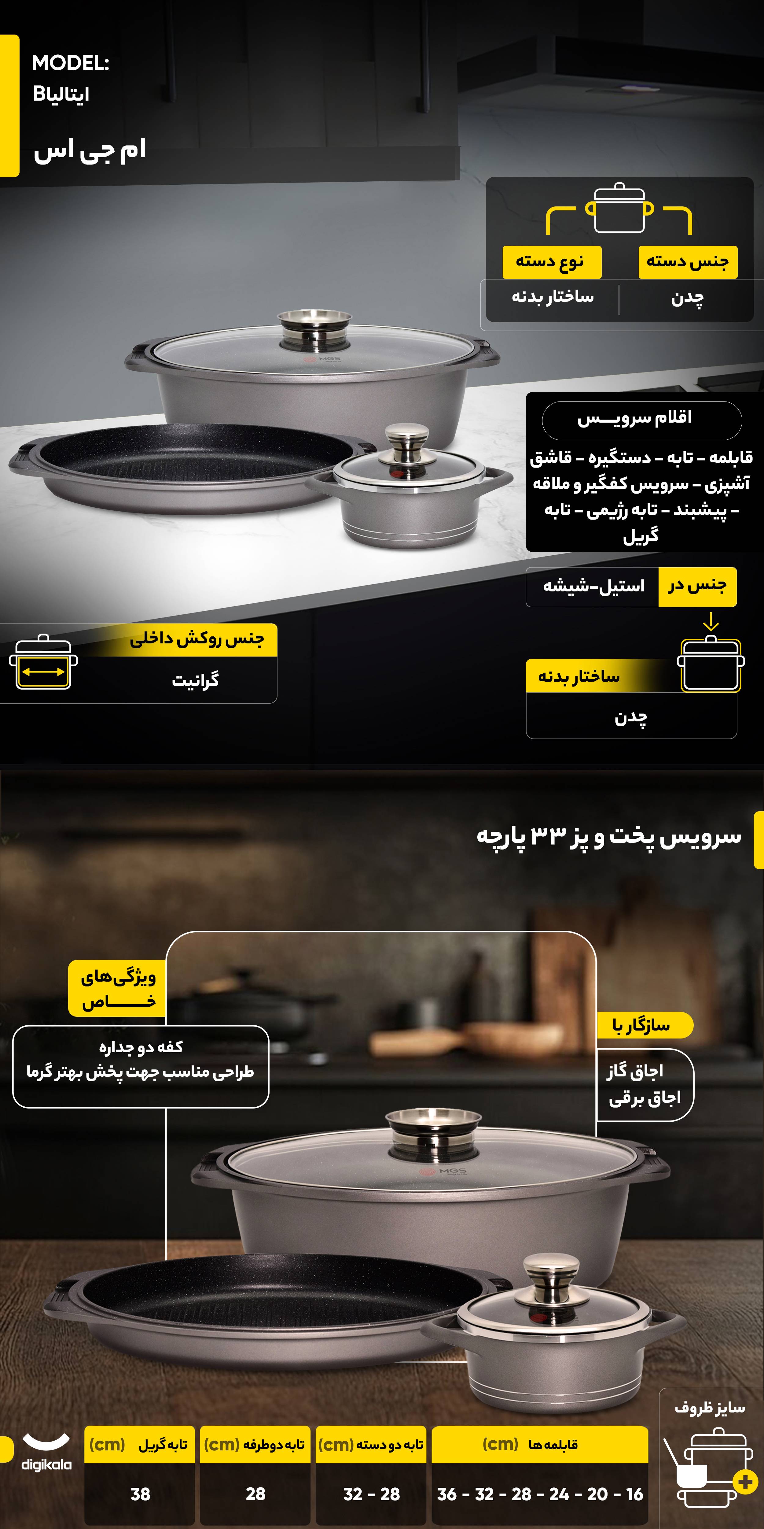 سرویس پخت و پز 33 پارچه MGS طرح ایتالیا B تجربه‌ای کامل برای آشپزی روزمره به همراه تمام نیازهای خانواده فراهم‌ آورده است. نوع کالا شامل قابلمه، تابه و ابزار آشپزی متنوع با پوشش گرانیتی است. اقلام سرویس شامل قابلمه‌های قطر 16، 20، 24، 28، 32 و 36 سانتی‌متر؛ دو تابه دو دسته در قطر 28 و 32 سانتی‌متر، تابه رژیمی گرد 28 سانتی‌متری، تابه ویژه مرغ و ماهی بیضی 38 سانتی‌متری همراه درب پیرکس مشترک و قالب گریل ومرغ‌پز 38 سانتی‌متری، ست هفت‌تکه کفگیر و ملاقه، چهار عدد دستگیره و یک پیشبند ...بیشتر