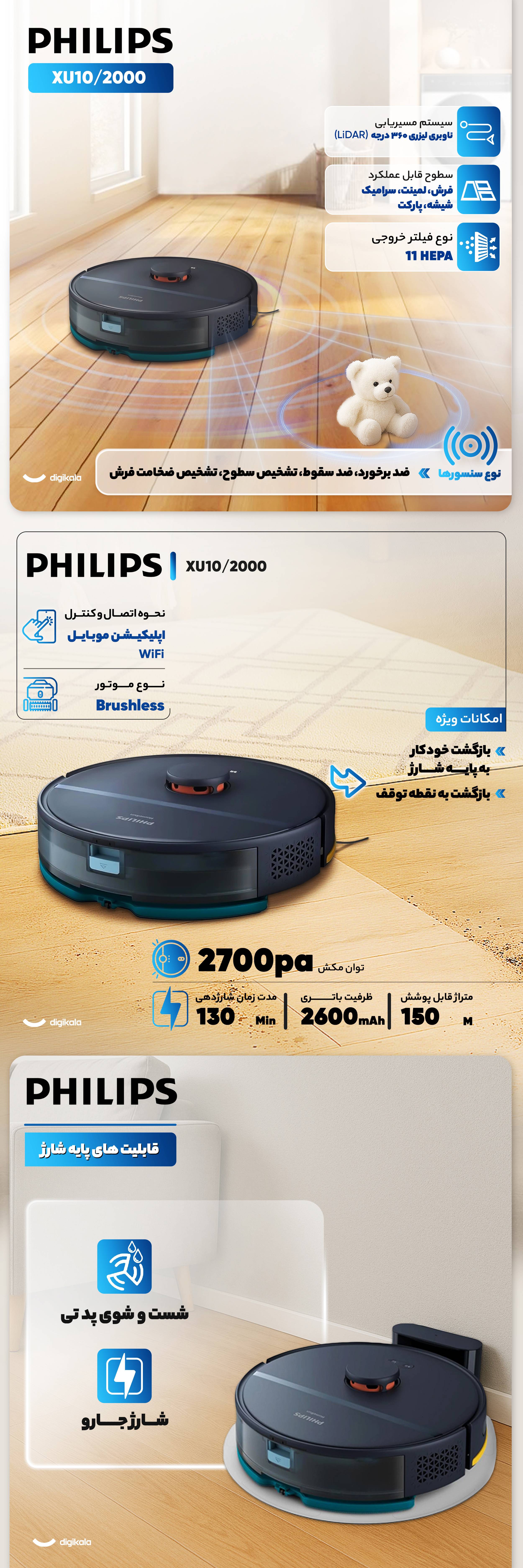 جاروبرقی رباتیک فیلیپس مدل XU2000/10 با ابعاد 345x345x97 میلیمتر و وزن 3.1 کیلوگرم، یک دستیار هوشمند و کارآمد برای نظافت منزل شماست. این جارو رباتیک با توان مکش 2700 پاسکال و موتور براشلس (Brushless)، به راحتی گردوغبار را از سطوح مختلفی مانند پارکت، لمینت، سرامیک، شیشه و فرش جمعآوری میکند. صدای عملکرد آن تنها 66 دسیبل است و فیلتر خروجی HEPA 11 نیز به تصفیه هوای خروجی کمک میکند.