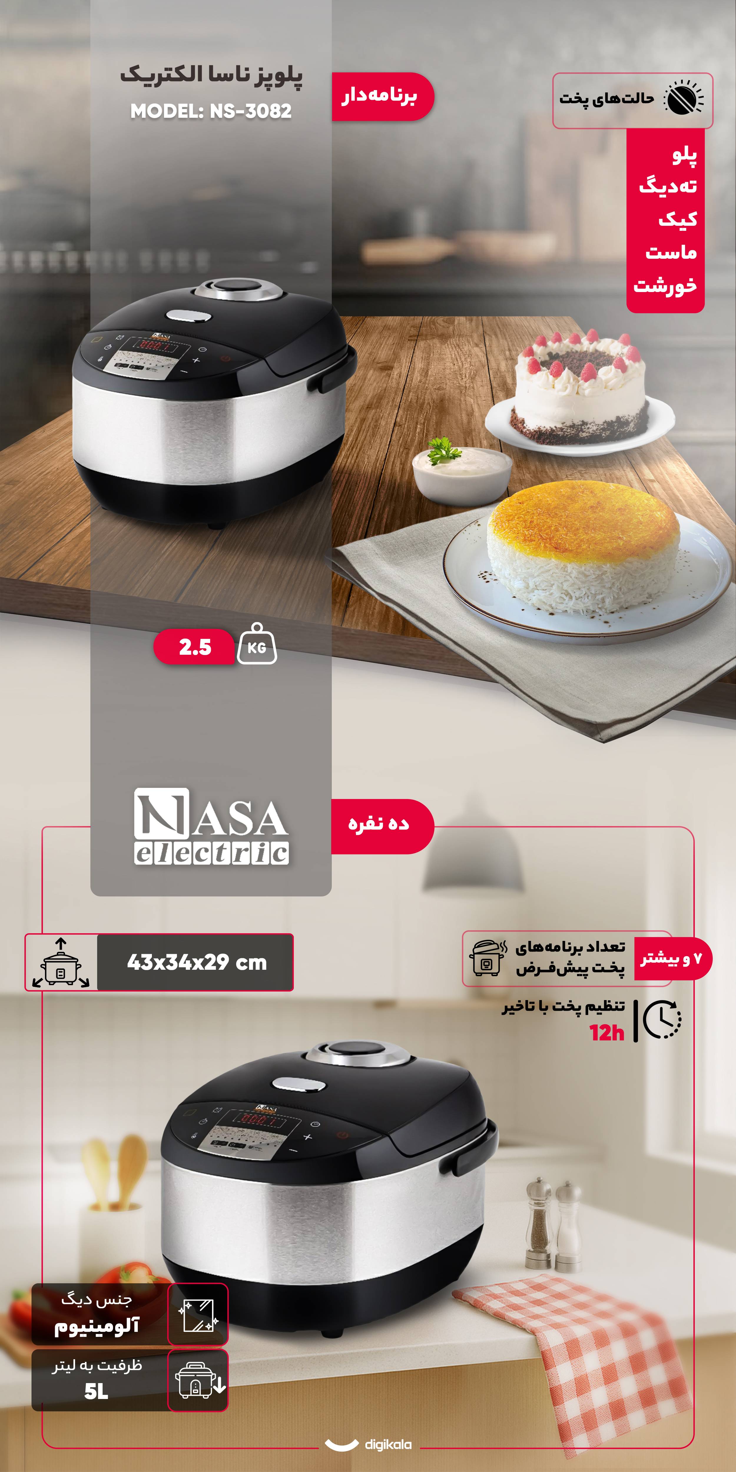 پلوپز NS-3082 از برند ناسا الکتریک، یک دستگاه برنامهدار قدرتمند با ظرفیت 5 لیتر است که برای خانوادههای پرجمعیت و مهمانیهای خانگی طراحی شده است. این مدل با توان مصرفی 1000 وات و بیش از 7 برنامه پخت، امکان آمادهسازی غذاهای متنوعی از جمله پلو، تهدیگ، کیک، ماست و خورشت را در اختیار کاربر قرار میدهد.