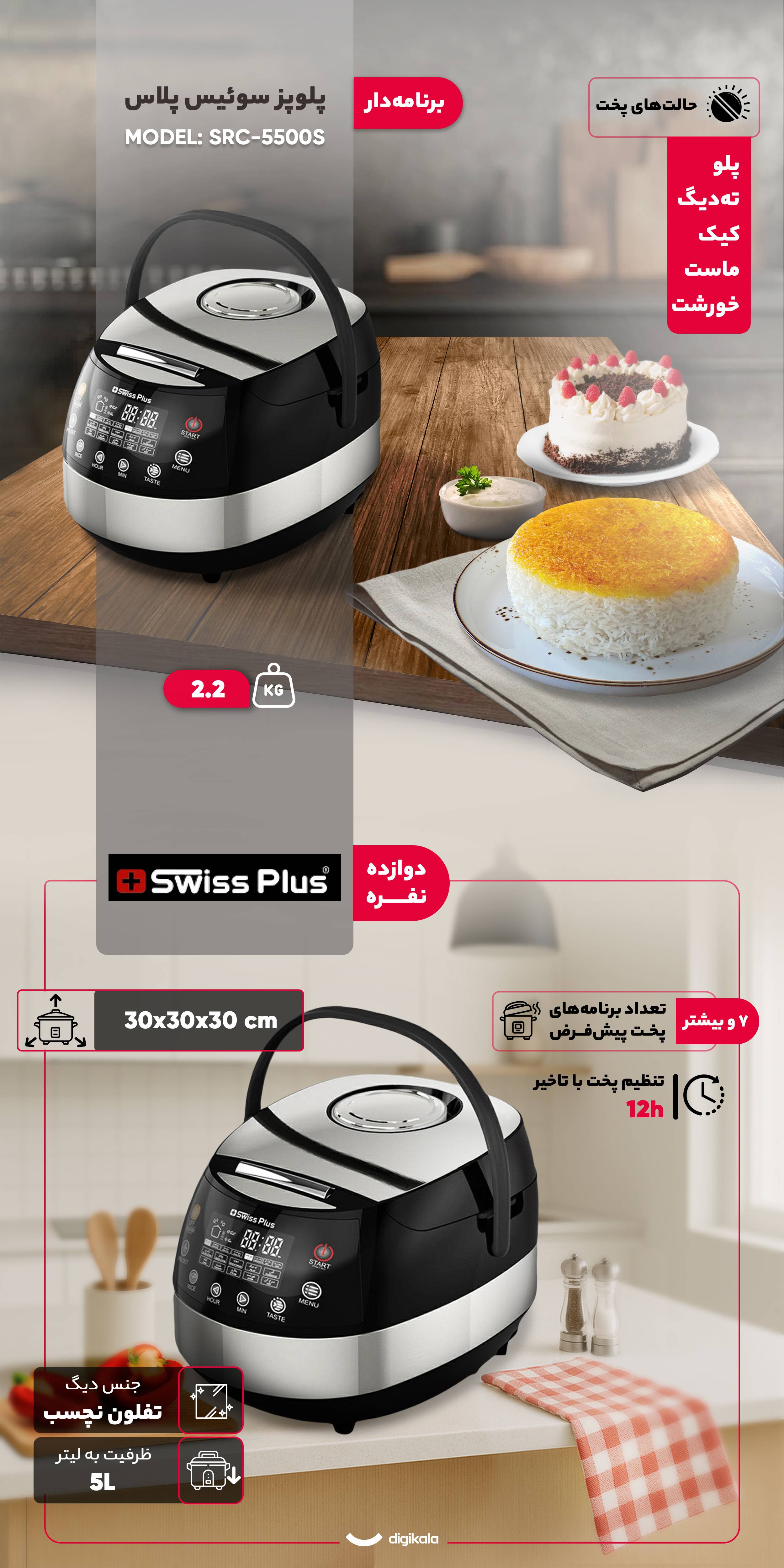 پلوپز SRC-5500S از برند سوئیس پلاس، دستگاهی پرقدرت و جادار با ظرفیت 5 لیتر است که برای خانوادههای بزرگ و دورهمیهای پرجمعیت طراحی شده است. این مدل با توان مصرفی 900 وات و بیش از 7 برنامه پخت پیشفرض، قابلیت آمادهسازی غذاهای متنوعی مانند پلو، تهدیگ، کیک، ماست و خورشت را در اختیار کاربر قرار میدهد.