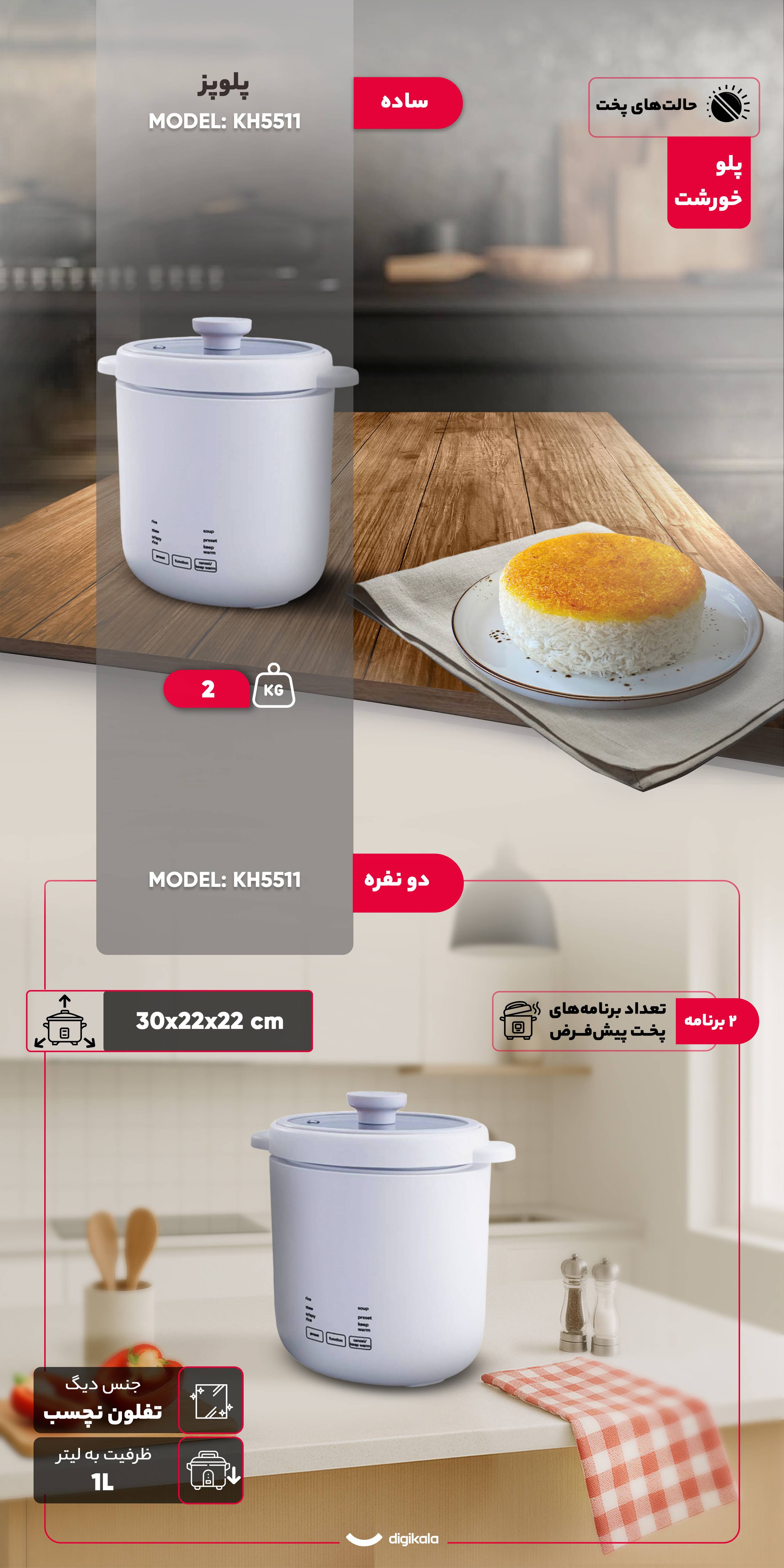 پلوپز دو نفره مدل KH5511 دستگاهی کوچک، کم‌مصرف و کاربردی است که برای خانواده‌های کم‌جمعیت، زوج‌های جوان یا افرادی که به‌تنهایی زندگی می‌کنند طراحی شده است. توان مصرفی این دستگاه تنها 200 وات است و همین موضوع آن را در دسته پلوپزهای اقتصادی و بهینه قرار می‌دهد. با وجود توان پایین، سیستم گرمایش المنت پایین توانسته نیاز به پخت یکنواخت برنج و حتی تهیه خورشت‌های ساده را پوشش دهد.