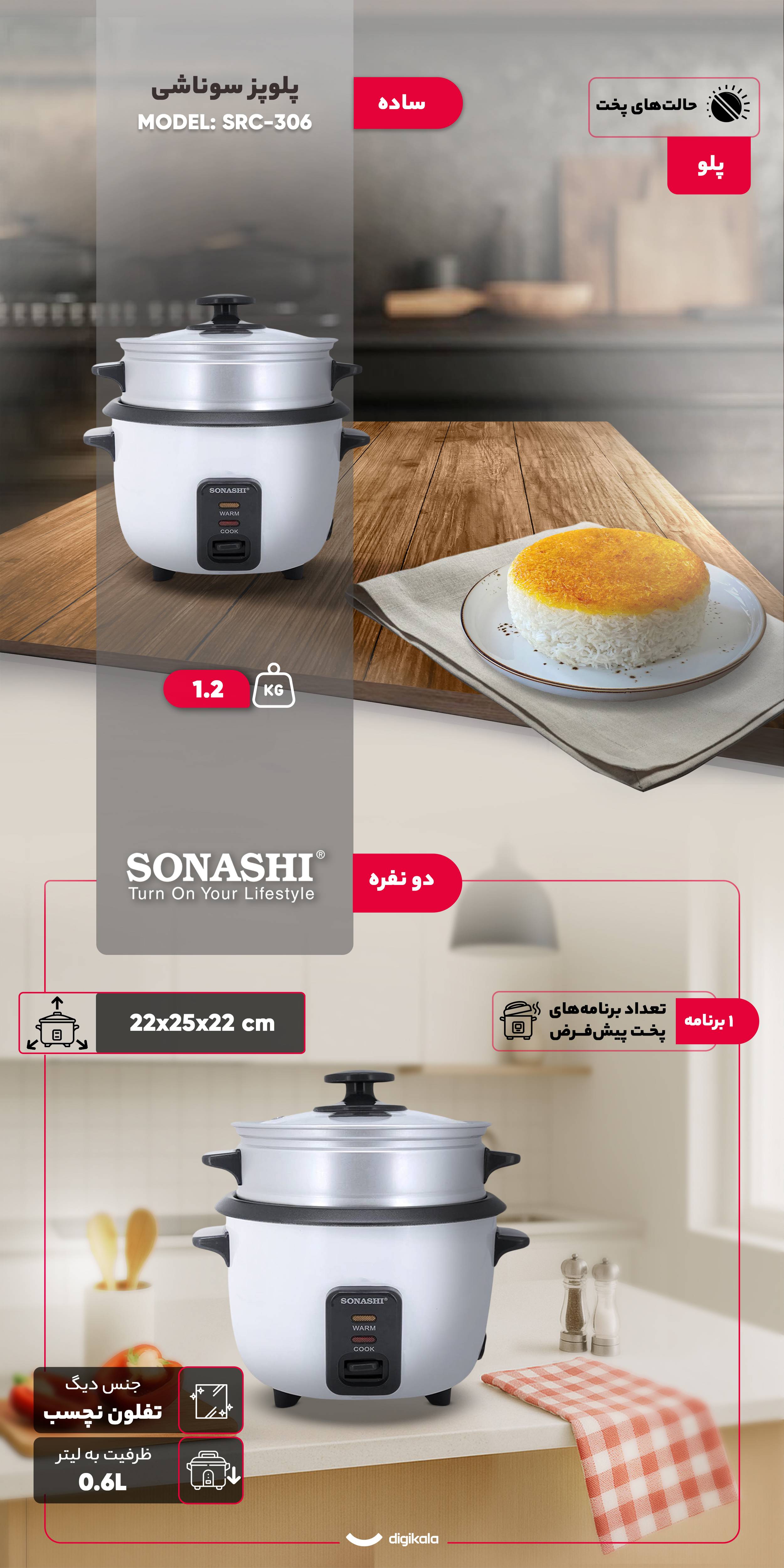 پلوپز سوناشی مدل SRC-306 یک دستگاه کوچک و کاربردی است که برای خانواده‌های کم‌جمعیت یا استفاده‌های شخصی طراحی شده است. ظرفیت 0.6 لیتری این دستگاه امکان پخت برنج برای دو نفر را فراهم می‌کند و به‌ویژه برای زندگی‌های دانشجویی، خوابگاه‌ها یا دفاتر کار انتخابی ایده‌آل به شمار می‌رود.