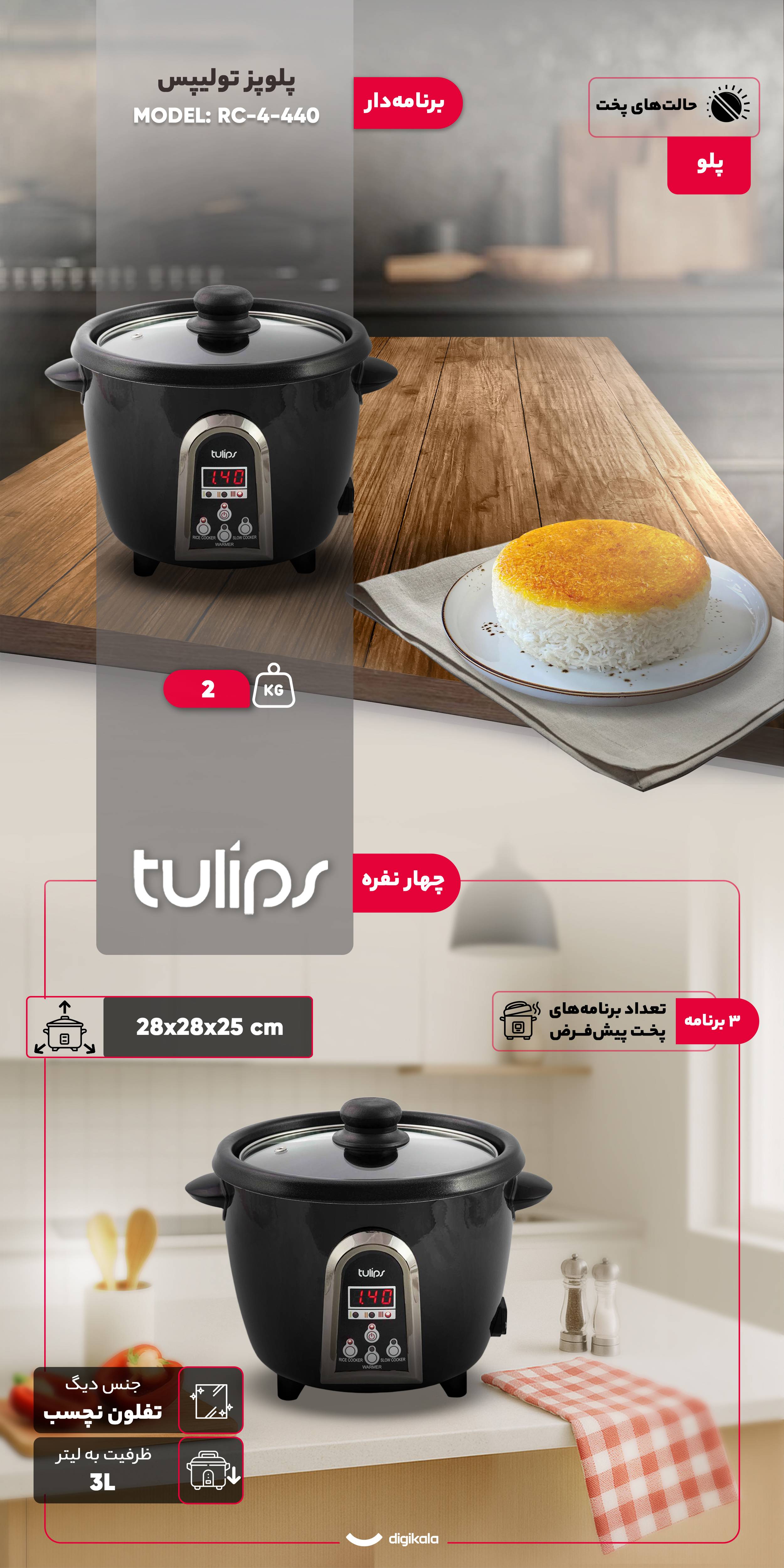 این مولتی کوکر از محصولات کارآمد تولیپس است که بر اساس استانداردهای ژاپنی و هنر ایرانی عرضه میشود. توان این پلوپز برابر با 520 وات است. این دستگاه از ظرف تفلون نچسب با قابلیت جدا شدن، بدنه مقاوم و درب شیشهای ساخته شده است که دارای دوام و کیفیت قابلتوجهی است. پلوپز تولیپس مدلRC - 440 - 4 (4 نفره) دارای پلوپز با سه نوع ته دیگ، گرم نگهدارنده، آرام پز است که با استفاده از دکمههایی که در جلوی آن قرار گرفته است، قابل انتخاب است. با استفاده از تایمر در نظر گرفته شده میتوانید ز ...بیشتر