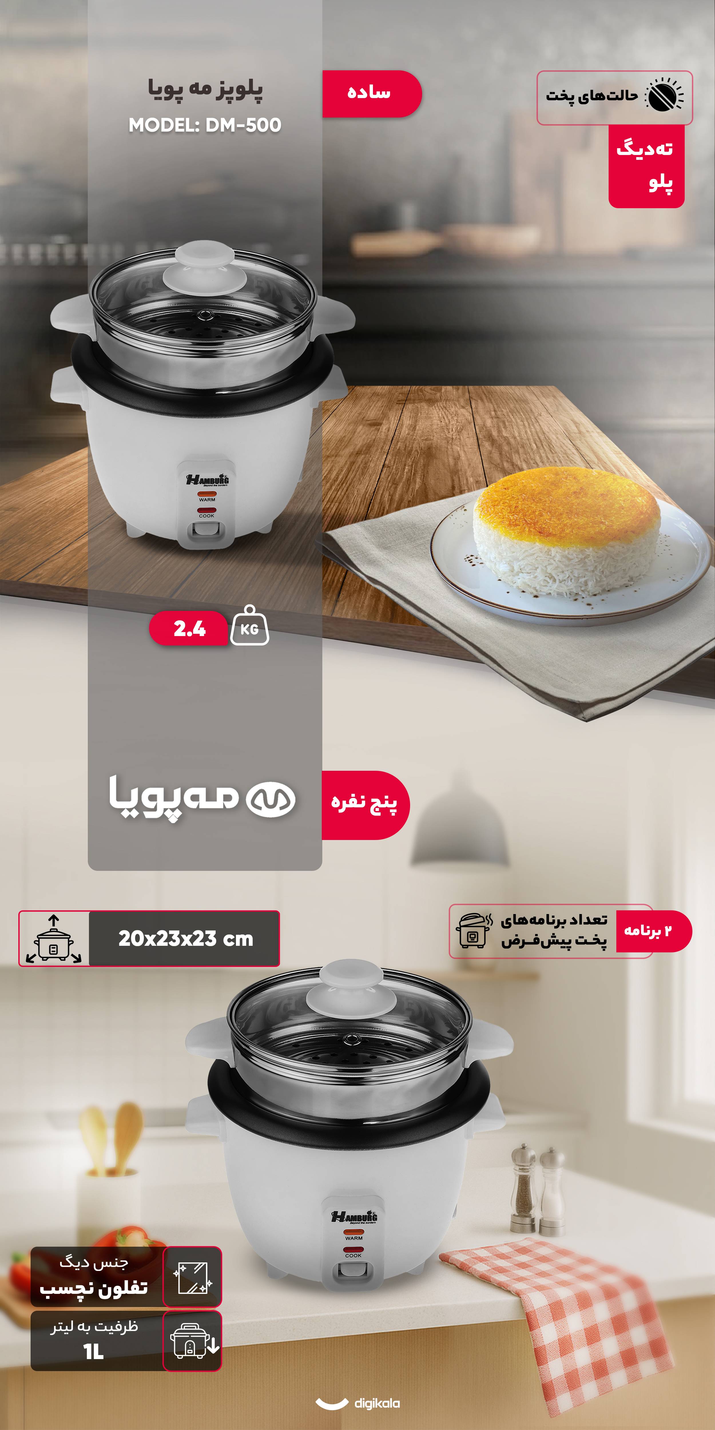 پلوپز مه پویا مدل DM-500 یک دستگاه ساده و کاربردی برای خانوادههای کوچک و متوسط است که ظرفیت آن 1 لیتر بوده و برای 5 نفر مناسب است. وزن سبک 2.4 کیلوگرم و ابعاد جمعوجور 20x23x23 سانتیمتر، این پلوپز را برای قرارگیری روی میز یا کابینت مناسب کرده و جابهجایی آن را آسان میکند.
