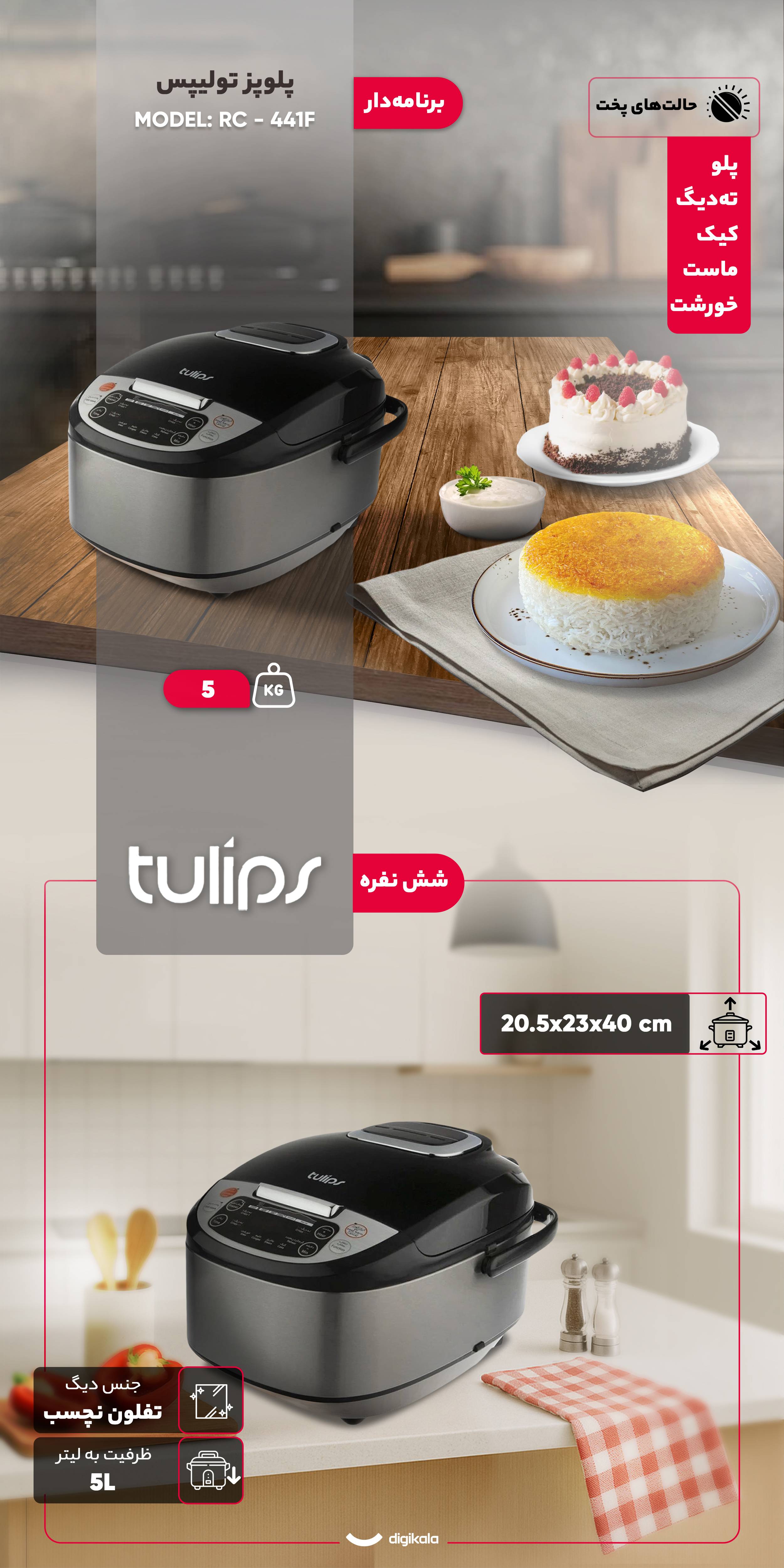 پلوپز 6 نفره تولیپس مدل RC-441F یک دستگاه برنامهدار است که با توان مصرفی 750 وات، برای خانوادههای متوسط و جمعهای شش نفره طراحی شده است. سیستم گرمایش این دستگاه از نوع المنت پایین است که پخت یکنواخت برنج و سایر خوراکها را امکانپذیر میکند. این پلوپز حالتهای متنوعی برای پخت ارائه میدهد و میتواند برنج، تهدیگ، کیک، ماست و خورشت را آماده کند و تجربه آشپزی ساده و راحتی برای کاربر فراهم نماید. ظرفیت 5 لیتری دستگاه، مناسب برای شش نفر بوده و با وزن 5 کیلوگرم و ابعاد 20.5x23x4 ...بیشتر