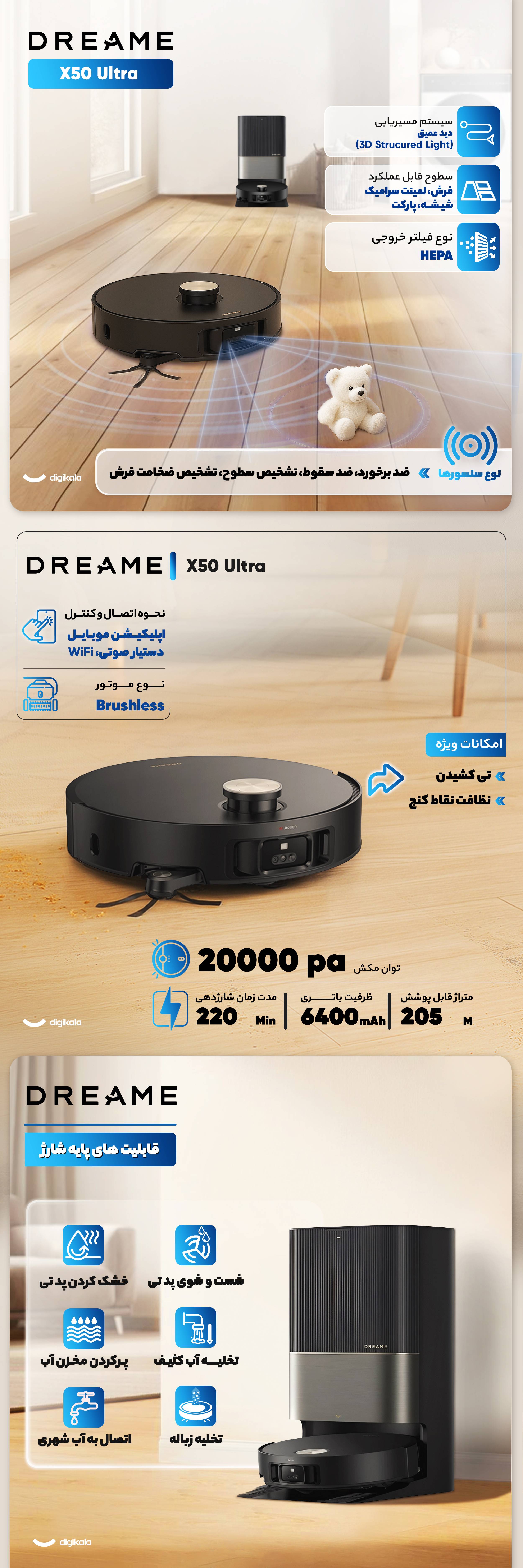 جاروبرقی رباتیک دریم مدل X50 Ultra با ابعاد 350x89x111 میلیمتر و وزن 4.3 کیلوگرم، یک سیستم نظافتی فوقالعاده پیشرفته و خودکار است. این جارو رباتیک با توان مکش بینظیر 20000 پاسکال و موتور براشلس (Brushless)، قدرتی فوقالعاده در جمعآوری گردوغبار و زباله از سطوح مختلف مانند پارکت، لمینت، سرامیک، شیشه و فرش دارد. فیلتر خروجی HEPA نیز به تصفیه کامل هوای خروجی کمک میکند.