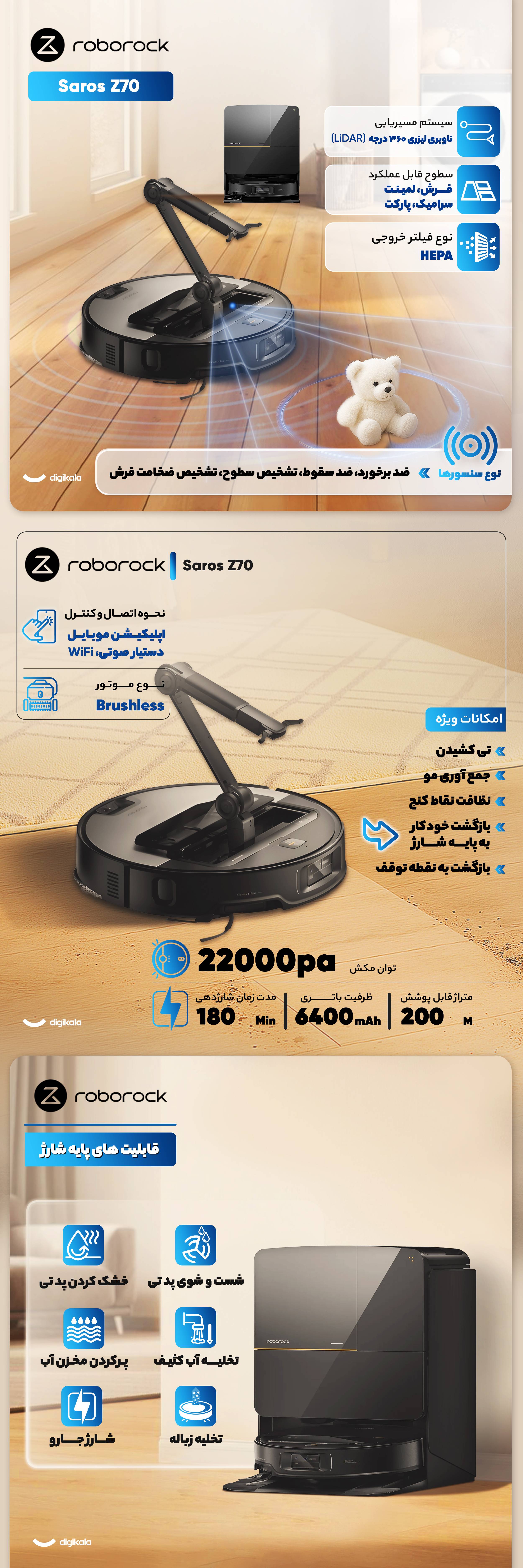 جاروبرقی رباتیک روبوراک مدل Saros Z70 یکی از قدرتمندترین و پیشرفتهترین محصولات این برند است که با طراحی ظریف و وزن 4.9 کیلوگرم عرضه میشود. موتور براشلس این دستگاه توان مکشی بینظیر معادل 22000 پاسکال ایجاد میکند و در کنار فیلتر خروجی HEPA، حتی کوچکترین ذرات گردوغبار را جذب کرده و محیطی بهداشتی و سالم فراهم میکند. میزان صدای تولیدی تنها 55 دسیبل است که عملکردی آرام و بیصدا را تضمین میکند. باتری قدرتمند 6400 میلیآمپر ساعت با یکبار شارژ، تا 180 دقیقه شارژدهی ارائه می ...بیشتر