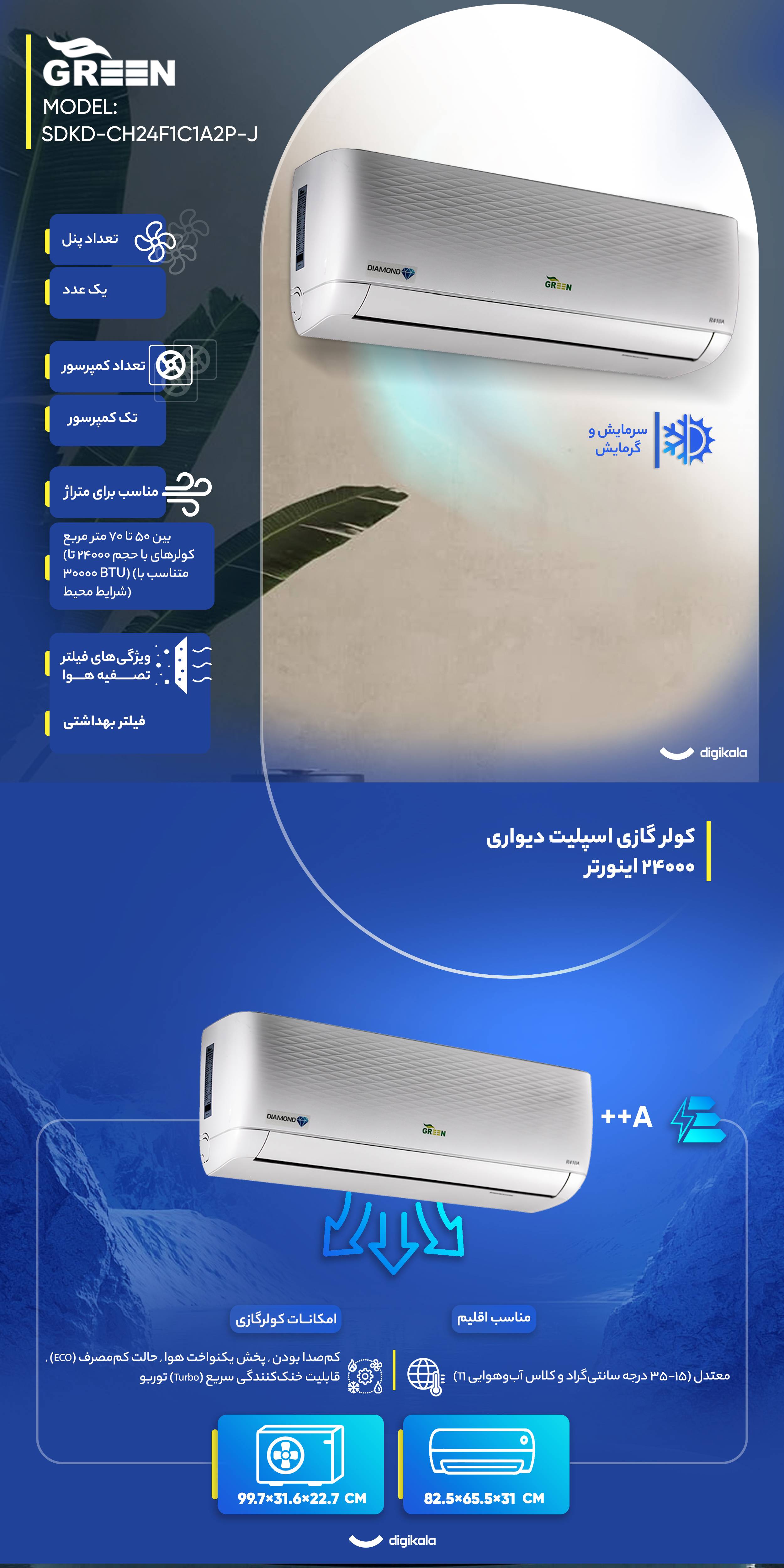کولر گازی اسپلیت دیواری 24000 اینورتر گرین مدل SDKD-CH24F1C1A2P-J