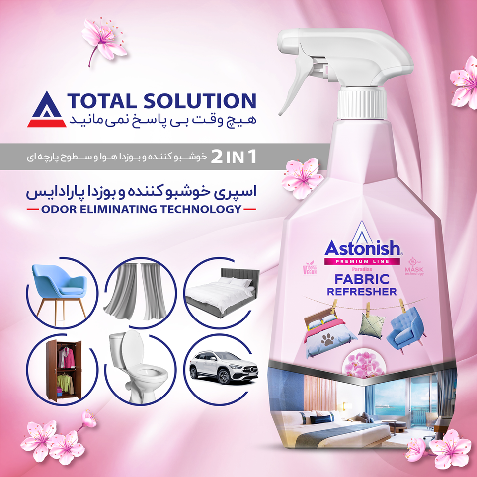 انتشار متداول بوهای نامطبوع مانند بوی سیگار، پخت و پز، تعریق، رطوبت، حیوانات خانگی و ... و جذب مولکولی روی سطوح پارچه ای محل کار و خانه مانند مبلمان، فرش، سرویس خواب، پرده، صندلی خودرو، البسه و تثبیت آن روی سطوح پارچه ای ، فضایی ناخوشایند را در محیط زندگی و کار بوجود می آورد که انرژی محیط را می گیرد. برند آستونیش محصولی به نام خوشبوکننده و بو زدا پارچه و هوا (Fabric Refresher) با حجم 750 میلی لیتر را به بازار عرضه کرده است که با بکار گیری تک ...بیشتر