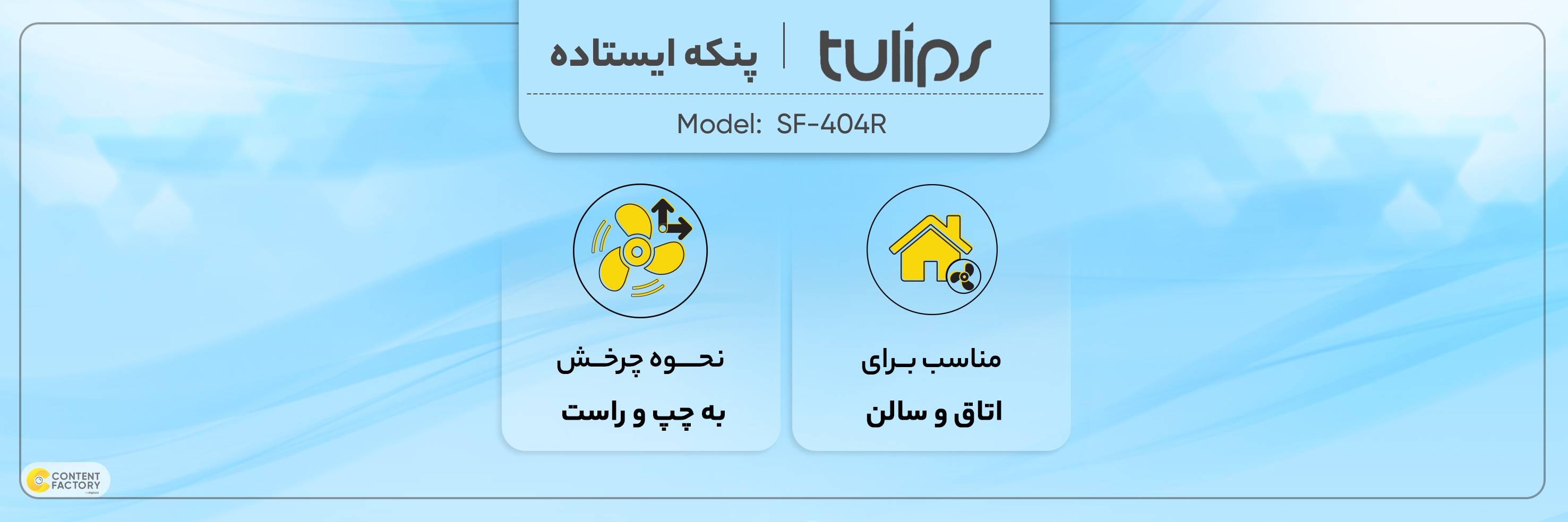پنکه تولیپس مدل SF-404R گزینهای پایهدار و ایستاده است که قابلیت تنظیم ارتفاع تا 100 سانتیمتر را دارد. این محصول جزو گزینههای مناسب برای محیطهایی با ابعاد متوسط تا 100 متر است و با وجود موتوری 50 وات میتواند باددهی مناسبی را در فضا ایجاد کند. امکان تغییر سرعت در سه حالت، وجود نمایشگر دیجیتال، عملکردی کم صدا همراه با پرتاب باد ایدئال به علت وجود پرههای ضخیم از دیگر مشخصههای این محصول است که با قیمت مناسبی هم ارائه شده است. لازم به ذکر است که این سیستمها از نظر مونتاژ محبوبیت دارند زیرا به سادگی و در کمترین زمان ممکن امکان اسمبل شدن، نصب و راهاندازی آن بدون هیچ تخصصی وجود دارد.