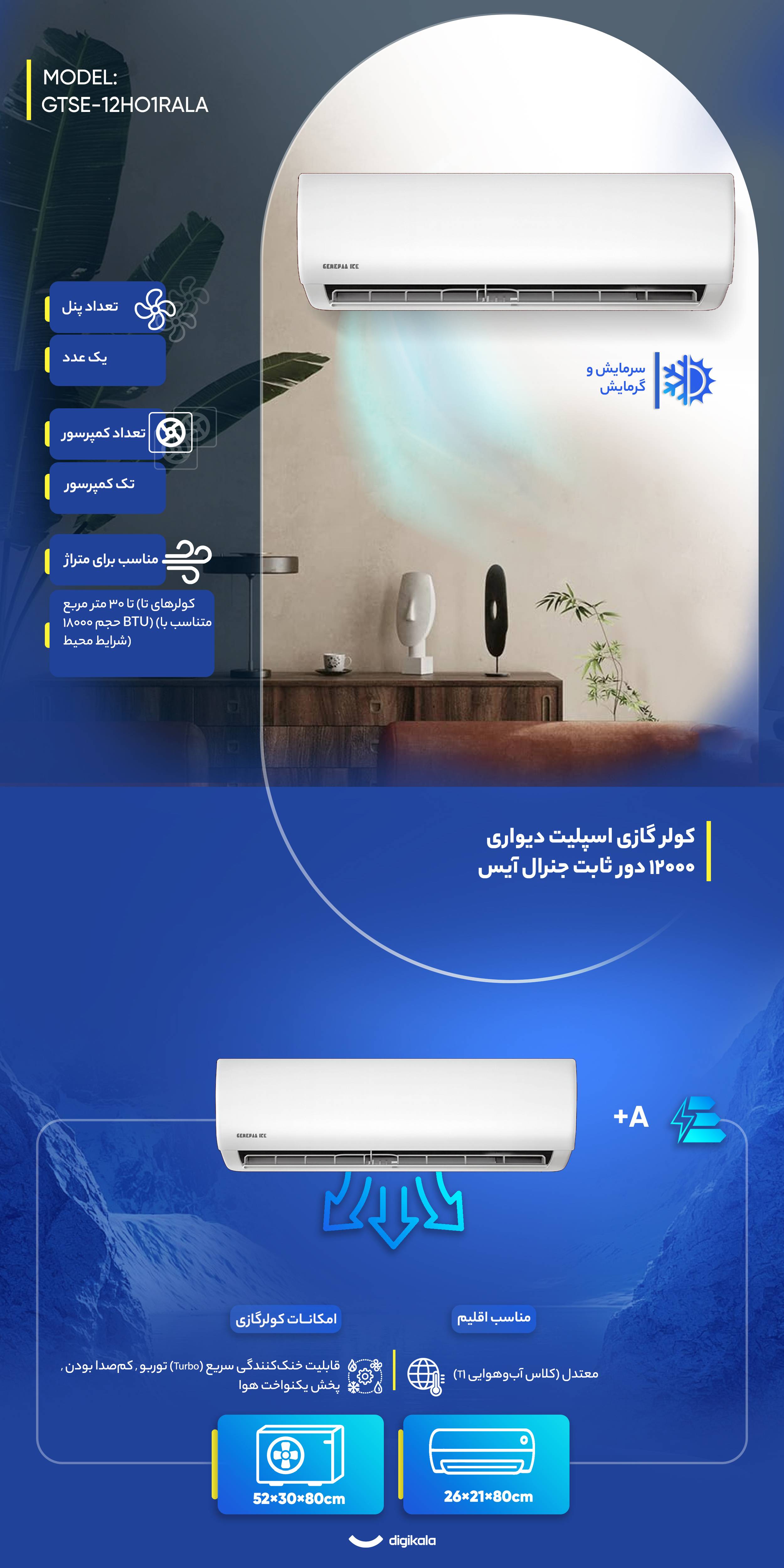 کولر گازی اسپلیت دیواری 12000 دور ثابت جنرال آیس مدل GTSE-12HO1RALA