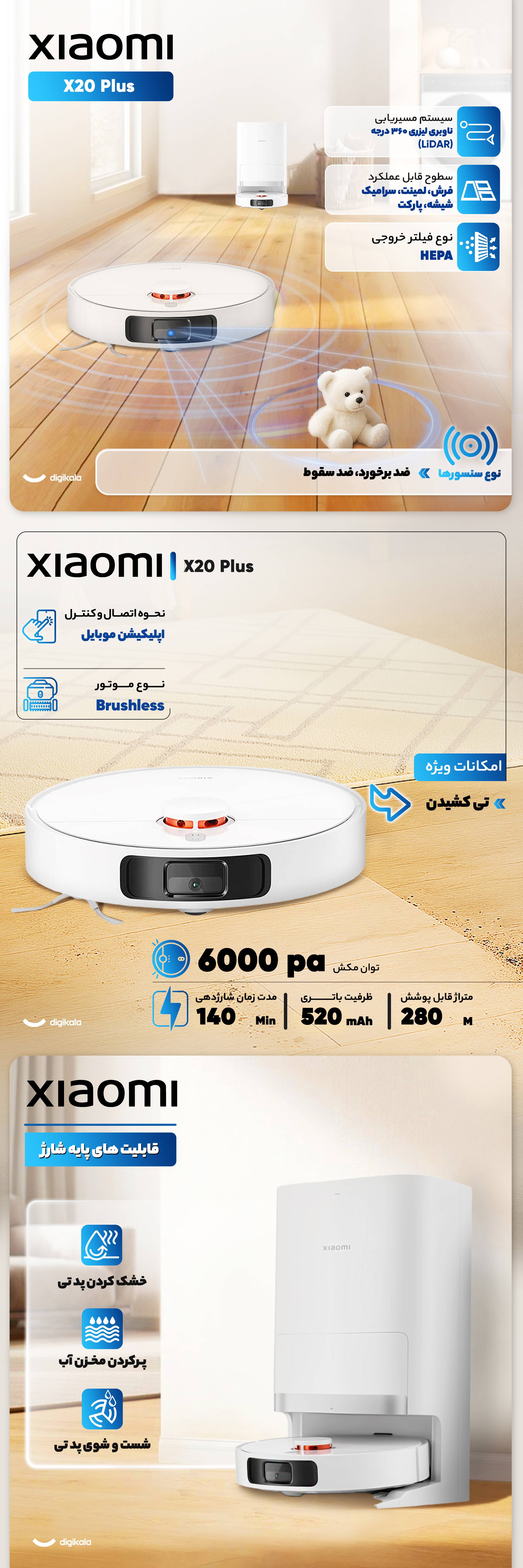 جاروبرقی رباتیک شیائومی مدل Robot Vacuum X20 Plus با ابعاد 350x350x97 میلیمتر و وزن 3.67 کیلوگرم، یک دستیار هوشمند و قدرتمند برای نظافت خانه شماست. این جارو رباتیک با توان مکش 6000 پاسکال و مخزن زباله 0.43 لیتری، گردوغبار و زباله را از سطوح مختلفی مانند پارکت، لمینت، سرامیک و انواع فرش و موکت به خوبی جمعآوری میکند. موتور براشلس (Brushless) آن عملکردی قوی و کارآمد دارد و فیلتر خروجی HEPA نیز به تصفیه هوای خروجی کمک میکند.
